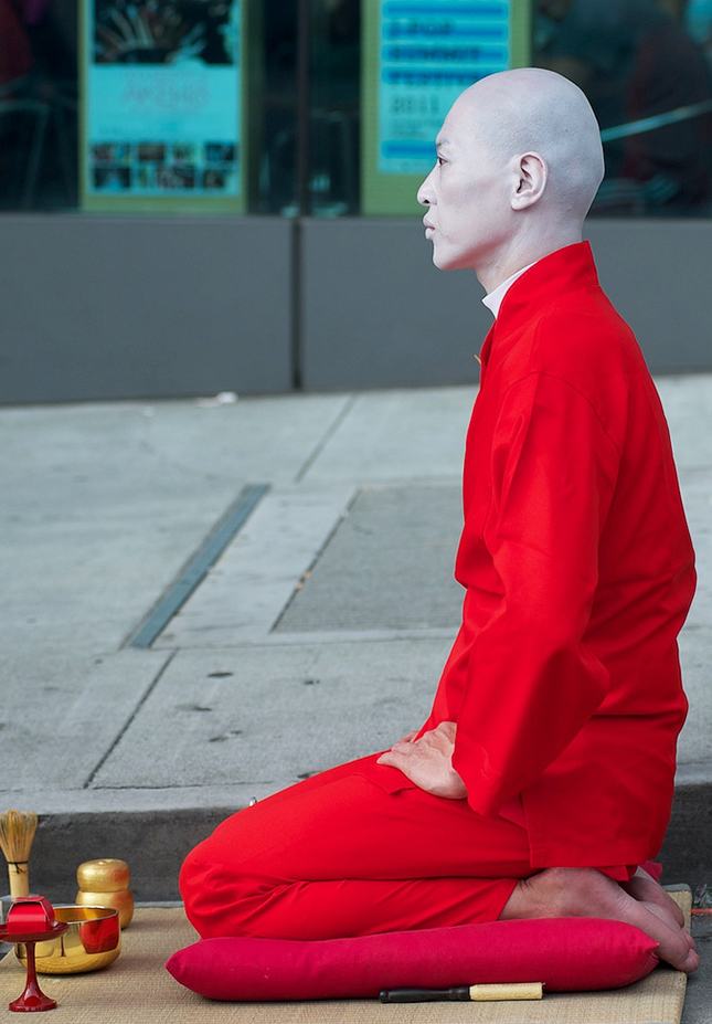 「座る」は”Red Tea Ceremony -YOU ARE GOD-“と称した茶道のパフォーマンスで、国内外様々な場所で披露しており、中でも、毎年アメリカ・ネバダの砂漠で開催されるアートイベント「バーニングマン」ではイベントのアイコンとして度々取り上げられている。